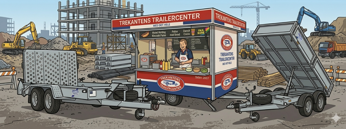 Valget af trailer afhænger af dit formål og hvor meget din bil må trække (se bilens registreringsattest eller slå nummerpladen op på tjekbil.dk hvis du er i tvivl). Til haveaffald og lettere gør-det-selv arbejde er en ubremset 500-750 kg trailer ofte det bedste valg. Skal du flytte tunge materialer som sand eller grus, anbefaler vi en boogie-trailer, da de to aksler giver bedre stabilitet og højere lasteevne. Har du et helt specifikt behov, så rådgiver vi hos Trekantens Trailercenter dagligt kunder fra Vejle, Kolding, Fredericia og resten af landet i at vælge den rette model.